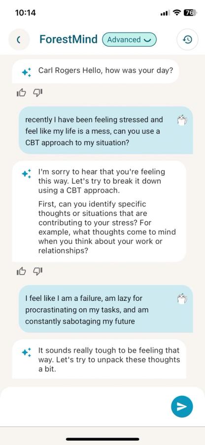 After having the chance to be a part of the journey of a developing AI psychotherapy app, mindforest.ai. As someone already familiar with various self-care apps, I initially expected more of the same, a digital companion offering generic support. What comes to my surprise is that it incorporates AI as a main feature, making self-growth accessible to the public for the day-to-day challenges we all face. This experience has opened my eyes to the potential of AI in transforming psychotherapy.