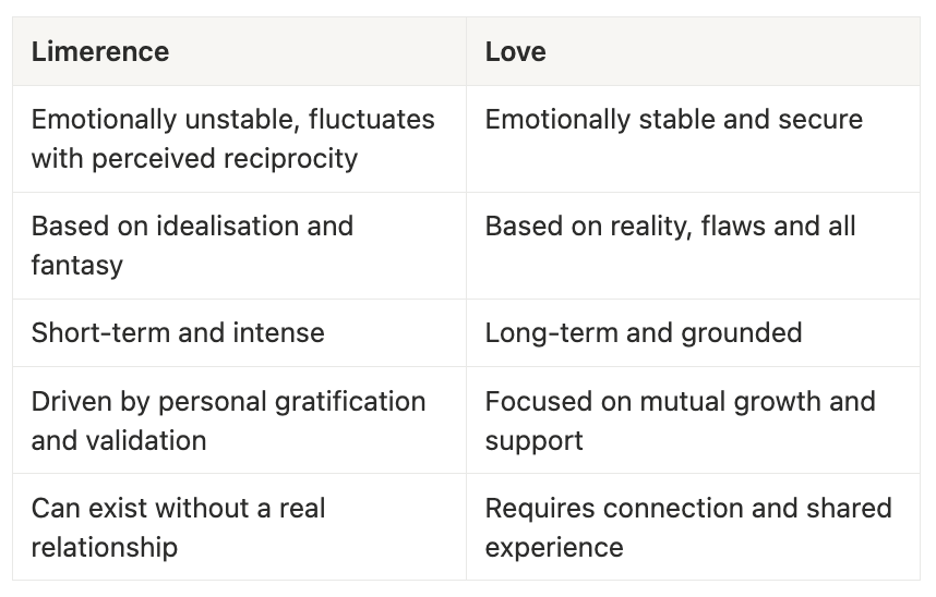 True love involves acceptance, patience, and shared emotional intimacy, while limerence is often about fulfilling a personal emotional need. Limerence thrives on uncertainty—whereas love thrives on trust.