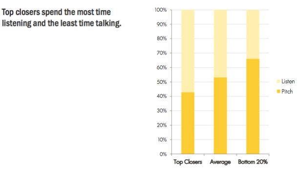 Interestingly, some market research studies have looked into the performance of various salespeople and found that the least effective salespeople spent about 60% of their time talking, leaving their clients with little time to express themselves. Conversely, the most successful salespeople only spoke 40% of the time, and much of that was spent asking their clients questions.