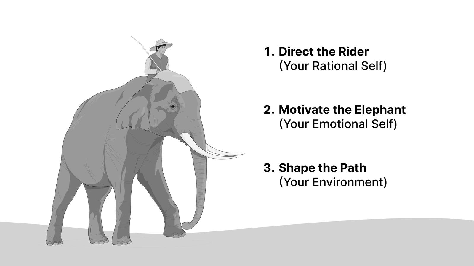 The Rider (our rational side) tends to overanalyze and deliberate. When the Rider doesn't know the destination or how to get there, they'll just lead the Elephant in circles. As long as the Rider adopt effective goal-setting with precise and measurable tasks, clearly knows the outcome of the change and how to implement it, the ideal future becomes much more attainable. With goal-setting in the right way, self discipline is easier to be cultivated.
